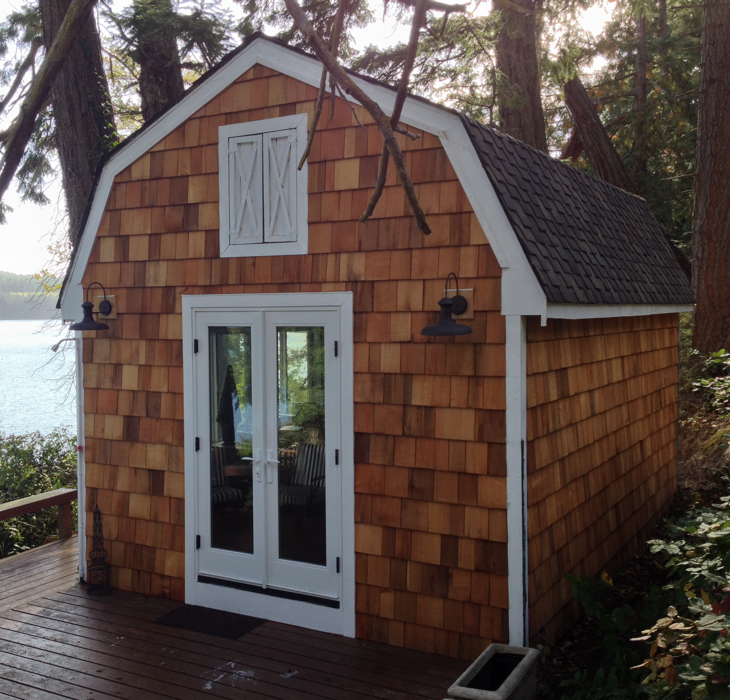 My hut came with the house, as a shed. The old shed got a new roof, hardwood floors, French doors, new windows, electricity, insulation, cedar shingle siding, tongue and groove pine ceiling, beaded board walls. More than I ever dreamt.