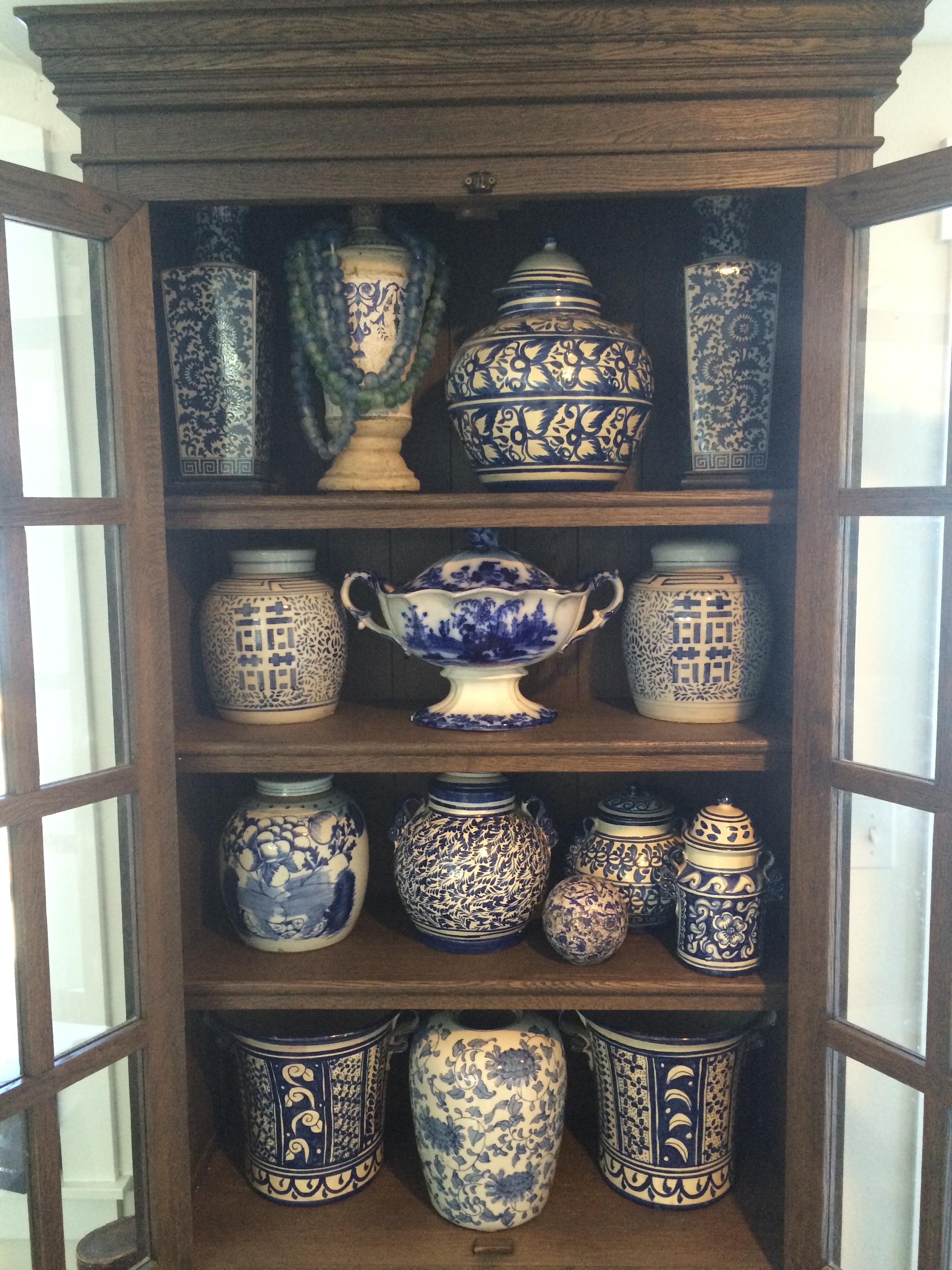 The Talavere pottery pieces were carried back on my lap from various trips to Mexico. The Japanese Ginger Jar, an acquisition from an antique shop, way over my budget. Chinese Ginger jar “finds” in consignment shops, to help make up for that. The soup tureen, gifted by my mother when she and dad  downsized into an apartment. In every case, all the blues look splendid together, and this has been my revelation again and again, over the ages.