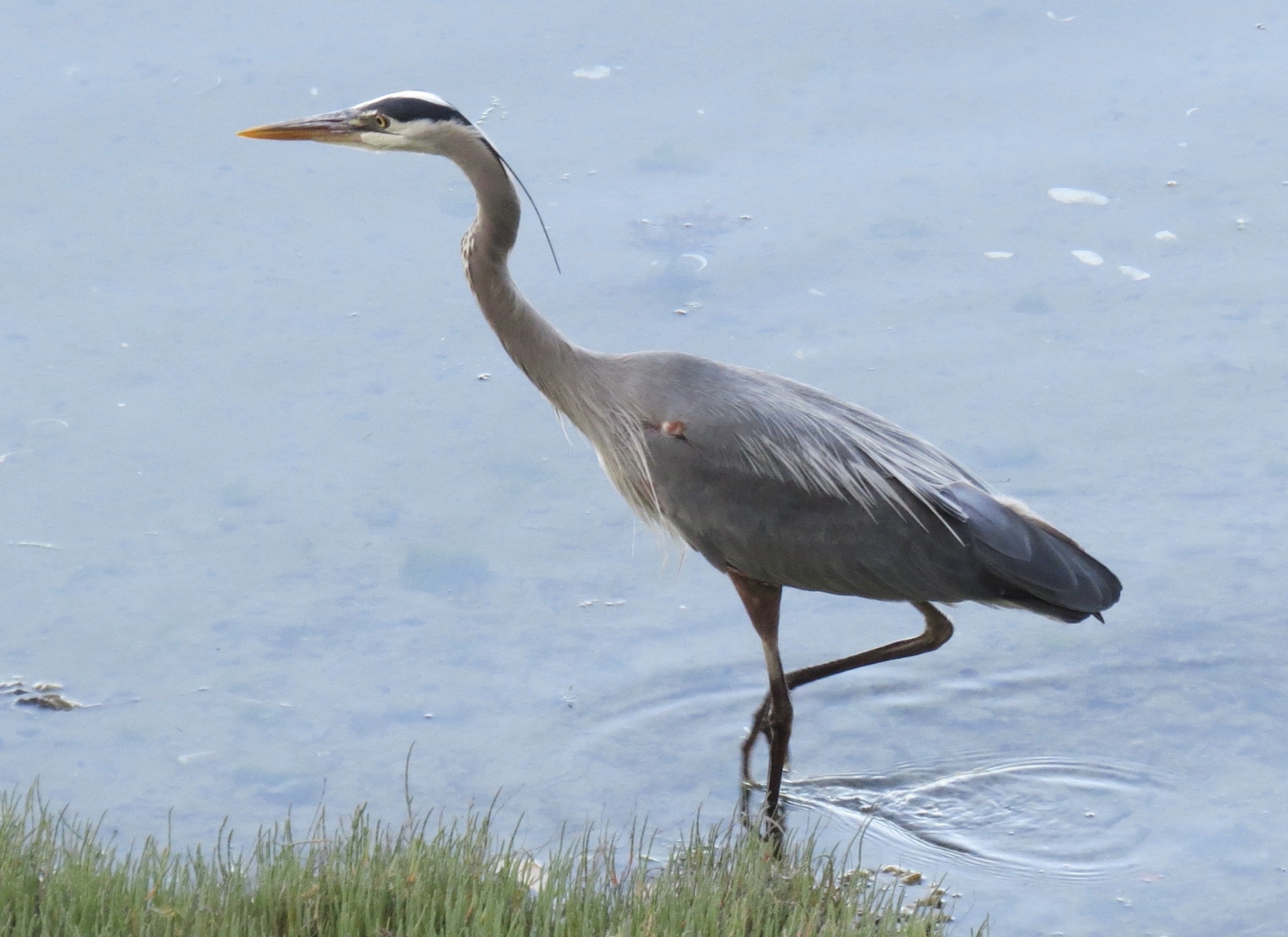 The heron surely represents patience. Poised like sculpture, wading in water–both freshwater and coastal–scanning for small fish, the great blue heron stands four foot tall on long skinny legs which possibly look like reeds in the water. Extending exceptionally long necks they strike their prey with lightning speed, spearing with razor-sharp bills.