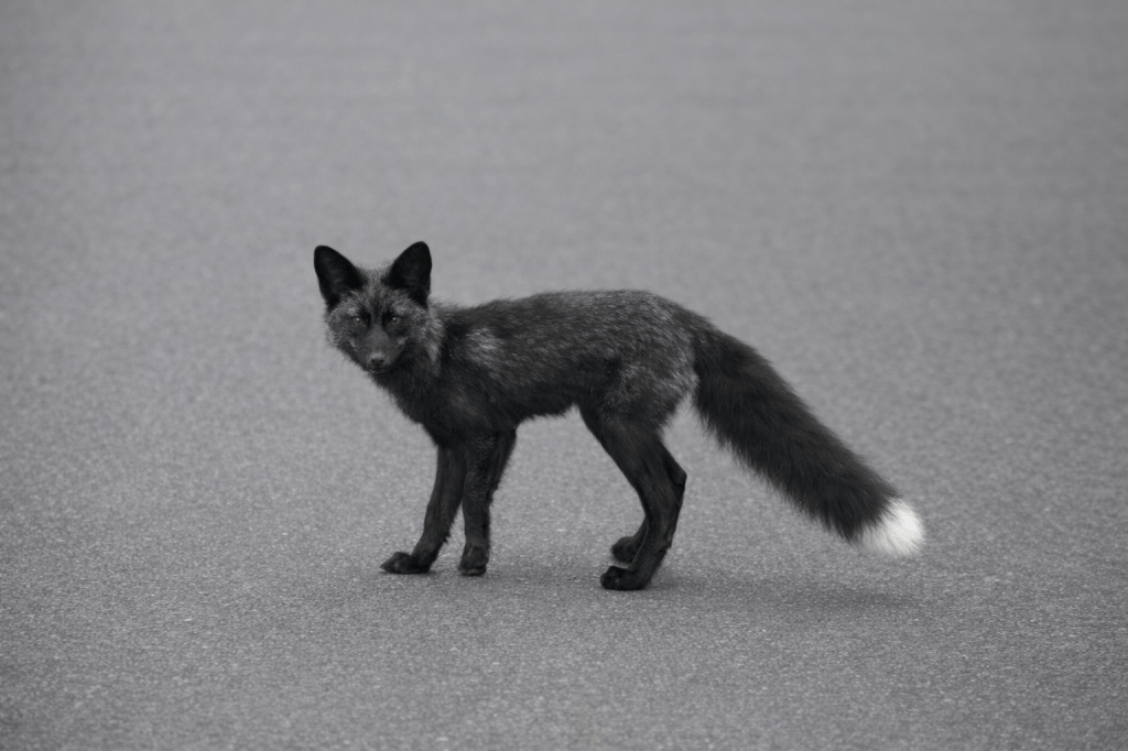 But on our island the fox thrives. The National Park Services asks visitors to keep a distance of at least 75 ft, though fox in our neighborhood don’t keep 75’ from us. They come out of the forest or emerge from culverts along the side of the road and walk the road and trails we do. One black fox in particular crossed our deck at the same time every evening for months, pausing close to the house to give eye contact to our dog in the window who was waiting for her. Dogs and wolves may be most closely related animals to the fox, though I see an almost feline face in the fox. But where are they?