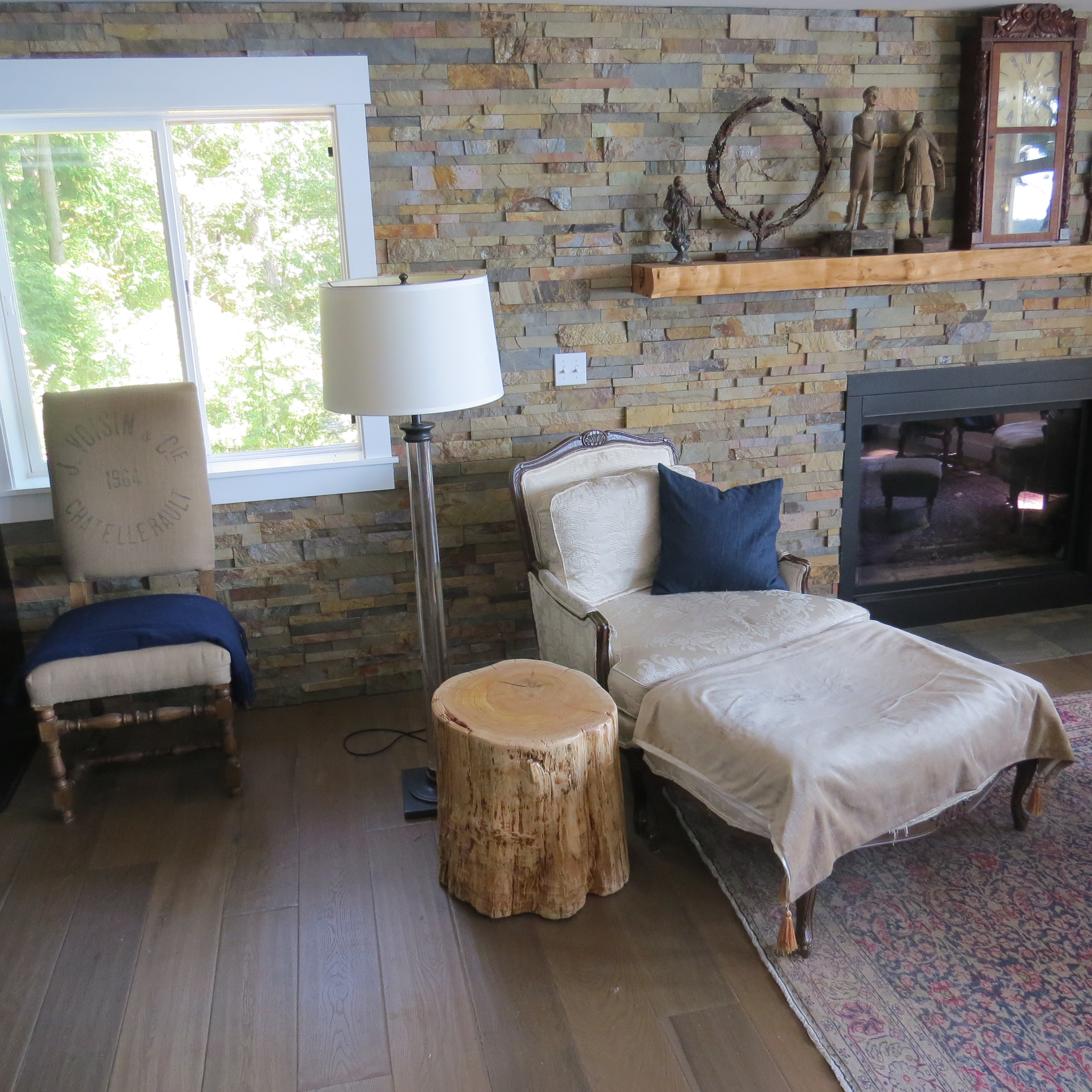 There were eight stumps in total. Four around the fire, three on a deck between Adirondack chairs there too, and one was so grand in size and particularly good looking, I placed it in the living room. My thinking now is that every French bergère chair should have a rustic cedar stump beside it.